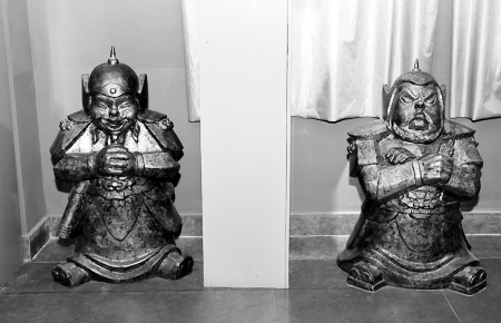 虽然穿着打扮还是古装,但是这对门神一个拿着对讲机、一个在铠甲中怀抱电棍。他们夸张的、带有漫画式线条的小脸上,一个对不受欢迎者板着脸,一个则对宾客露出开心笑容。