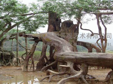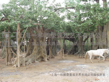 榕树林里的美只有在夜晚你才能感受到,而多场在绝情谷里的重头戏,诸如小龙女不认杨过,都是在这里拍摄的夜戏,加上梦境般的灯光,鲜艳的情花配上水雾,这里确实是一个可以让人忘忧忘情的地方。这个占地一千平米左右的榕树林,远远一看与真树无异,只是较之四周有些凋落的植被相比,就显得有些过青嫩了些。原来这一片枝繁叶茂,盘根错结的榕树林皆是由水泥浇铸而成,树皮纹路都做的栩栩如生,于敏导演表示连拍特写也不会担心穿帮。榕树林下便是鲜艳欲滴的情花丛,雾气管“埋伏”其中,不时的有水雾产生。