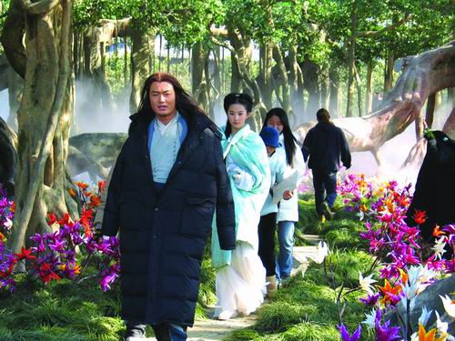 杨过、小龙女等在象山影视城“绝情谷”入口的“榕树林”里准备试镜。