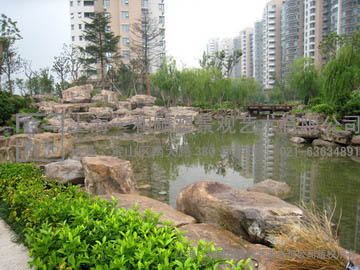 万科 逸天广场位于钱塘江南岸,与六和塔隔江相望,是一个纯高层的社区。其景观设计由泛亚环境(国际)担任。景观规划以建筑围合中心花园为基本形态,中心景区的景观设计强调了丰富性与参与性。 整个社区的东西纵深由整条300余米的水系贯穿。溪流边散点黄石,疏密大小、掩露起伏,尽取自然之意。溪流在社区的中心形成静水面,并延伸出可供业主参与的嬉水池。溪流源头塑石成岗,岗不高但有山石嵯峨之感。依坡临水处有两级叠水,是水系最生动之处。水石相错,意态清逸。水系周边起伏的坡地以及高矮错落的植被,在一定程度上遮蔽了高层建筑对景区中场所的压抑感,而丰富的小品更增添了环境体验中的趣味性。