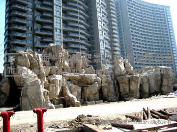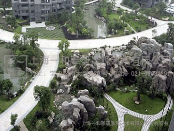 大假山位于园林景观的中心地带,南北30余米,宽10余米,最高峰12米。整个大假山创作中,我们组合的山体包括峰、峦、顶、岭、谷、壑、岗、壁、岩、岫、洞、台等,水体包括泉、瀑、潭、溪、池、矶和汀石等。相地布局,宾主分明,兼顾三远,依皴塑山。山水结合一体,相得益彰。
