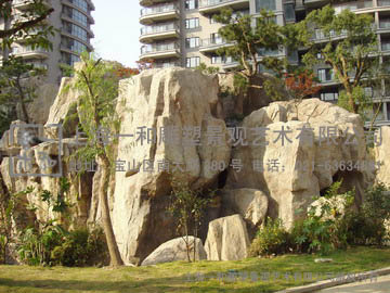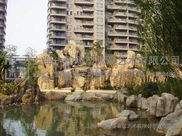 因假山庞大,内塑有山洞连接山体周围东西南北游览石径。洞内造型丰富:洞内套洞,有石柱,钟乳,在洞壁上设若干石隙,通风采光,游人有惊无险。园路围绕,面面可观,前后有瀑布,瀑布是本园山水的主要景观,主立面设主瀑布,其左右各设瀑布一。主瀑布为跌瀑,高处一股清泉从主峰石间冒出,泻至山腰石洼,石洼处水面飞流直下,旁逸小股叠泉折流,泻于池中。左右瀑布高低错落,形态各异。如此瀑布水景就有有线状、帘状、分流、叠落等式,集自然精华与一处。
